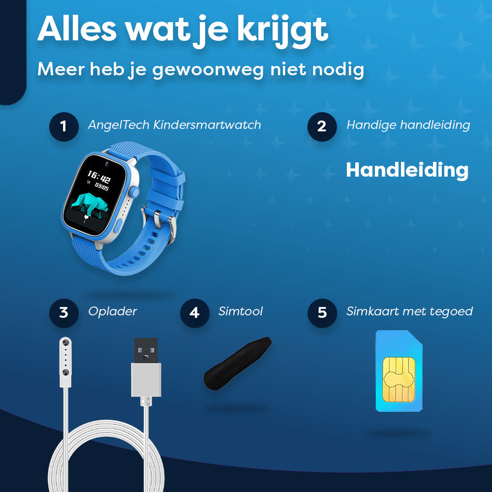 De AngelTech Kindersmartwatch Ultra wordt altijd geleverd inclusief een Lebara simkaart met al 5 euro te goed erop. Zo kun je meteen aan de slag! Ook zit er een kortingsactie bij waarbij je voor de eerste 20 euro dubbele data ontvangt, dus in totaal €45 gratis! Maar wees gerust, als je liever een andere provider gebruikt, is dat ook geen probleem. De AngelTech Ultra is volledig simlockvrij, dus je kunt er gewoon je eigen simkaart in doen.