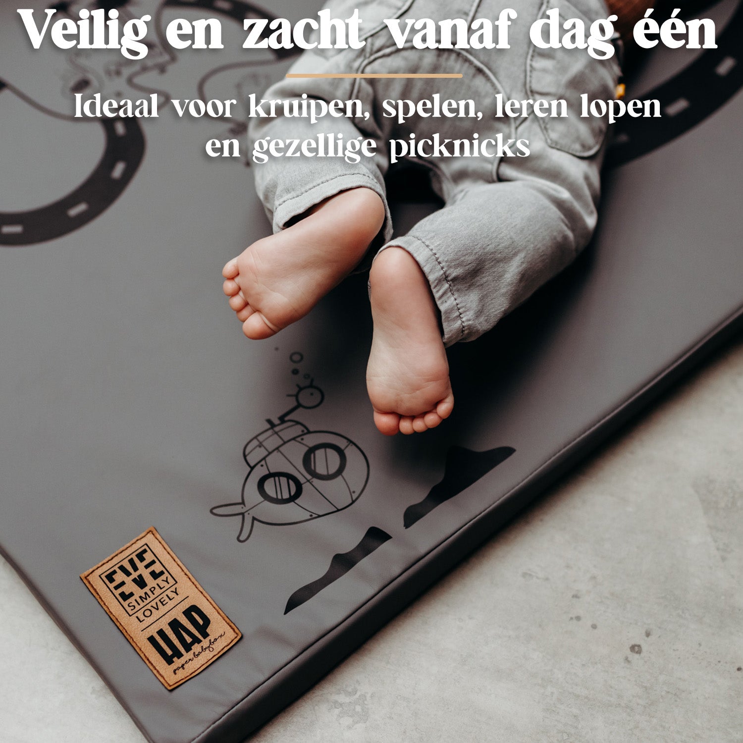 Onze speelmat is gemaakt van premium schuim en hoogwaardige stoffen die niet alleen zacht aanvoelen, maar ook beschermen tegen koude vloeren. De mat biedt perfecte ondersteuning voor je baby tijdens het spelen of rusten.